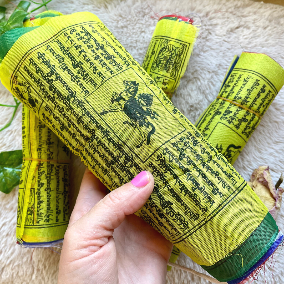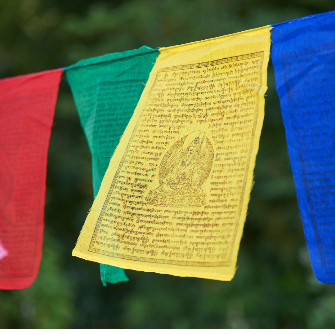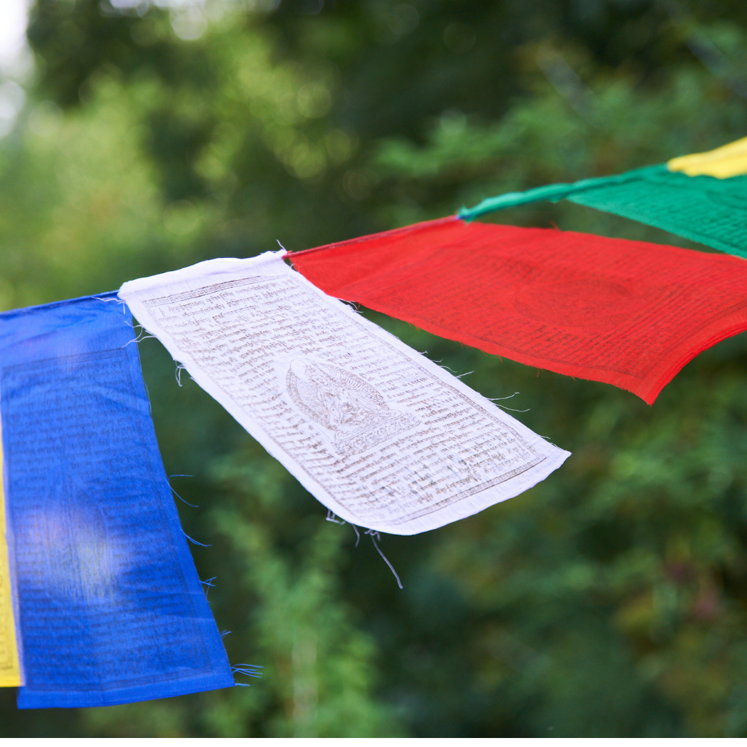 Accrocher un drapeau de prières tibétain est un moyen d'honorer la Terre, la nature, de remercier les divinités, d'amener paix et harmonie chez soi et pour sa famille, ainsi que d'être protégé.