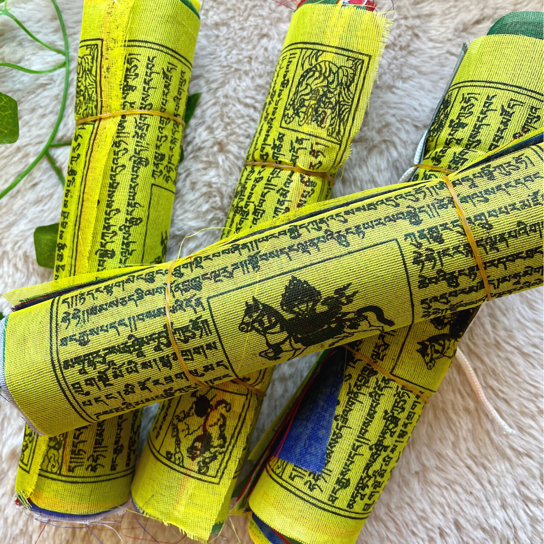 Les drapeaux tibétains sont très importants chez les Bouddhistes. Grâce au souffle du vent qui caresse les formules sacrées (matras et sutras), celles ci se dispersent et s'envolent jusqu'aux Dieux, touchant tout ce qui traverse leur course. Les différentes couleurs représentent les éléments de la nature.